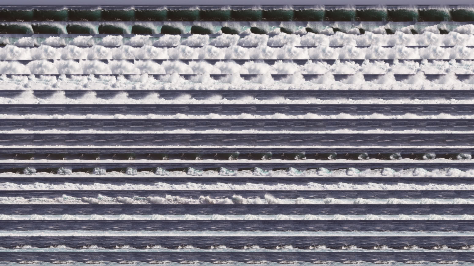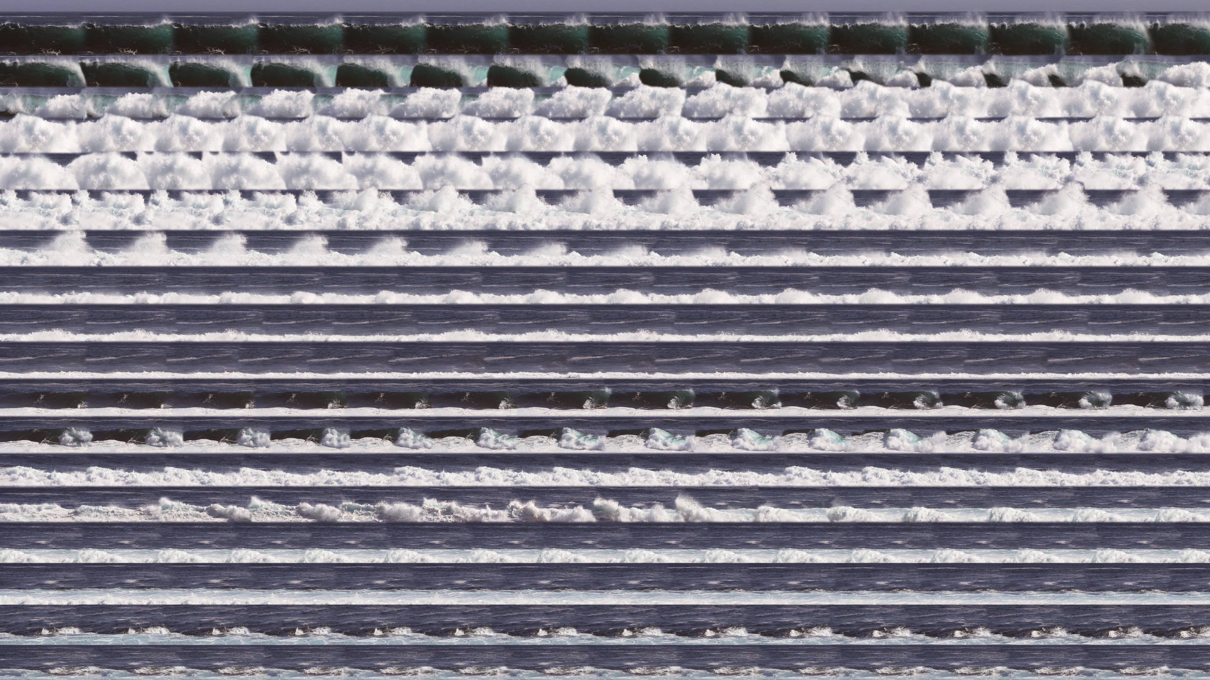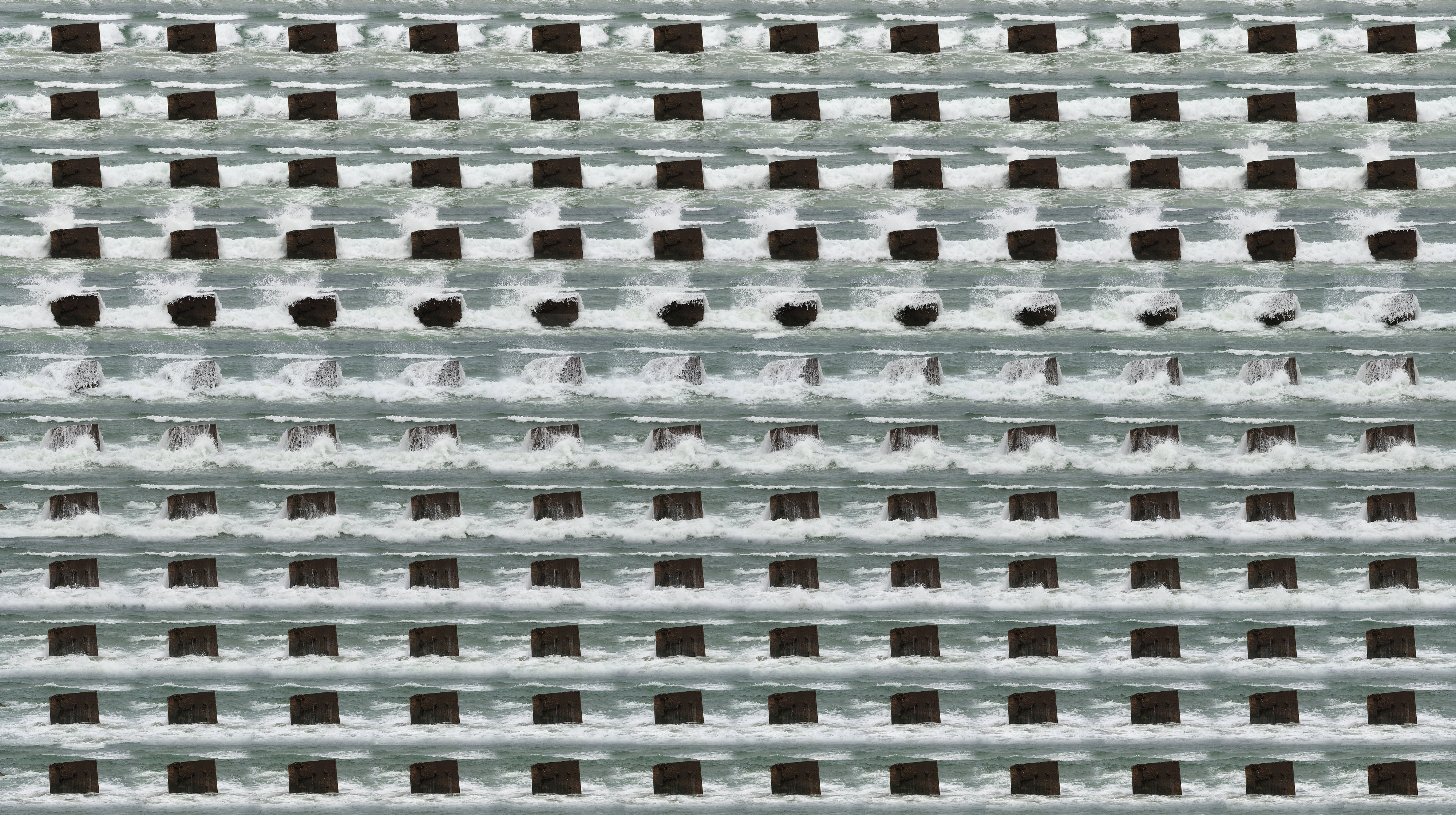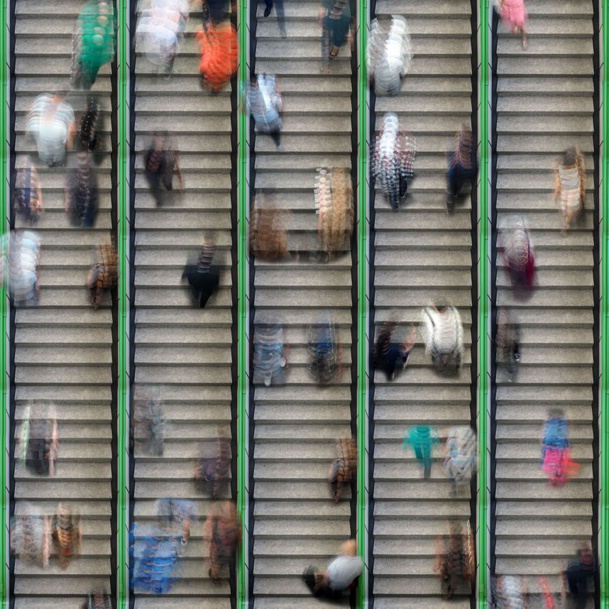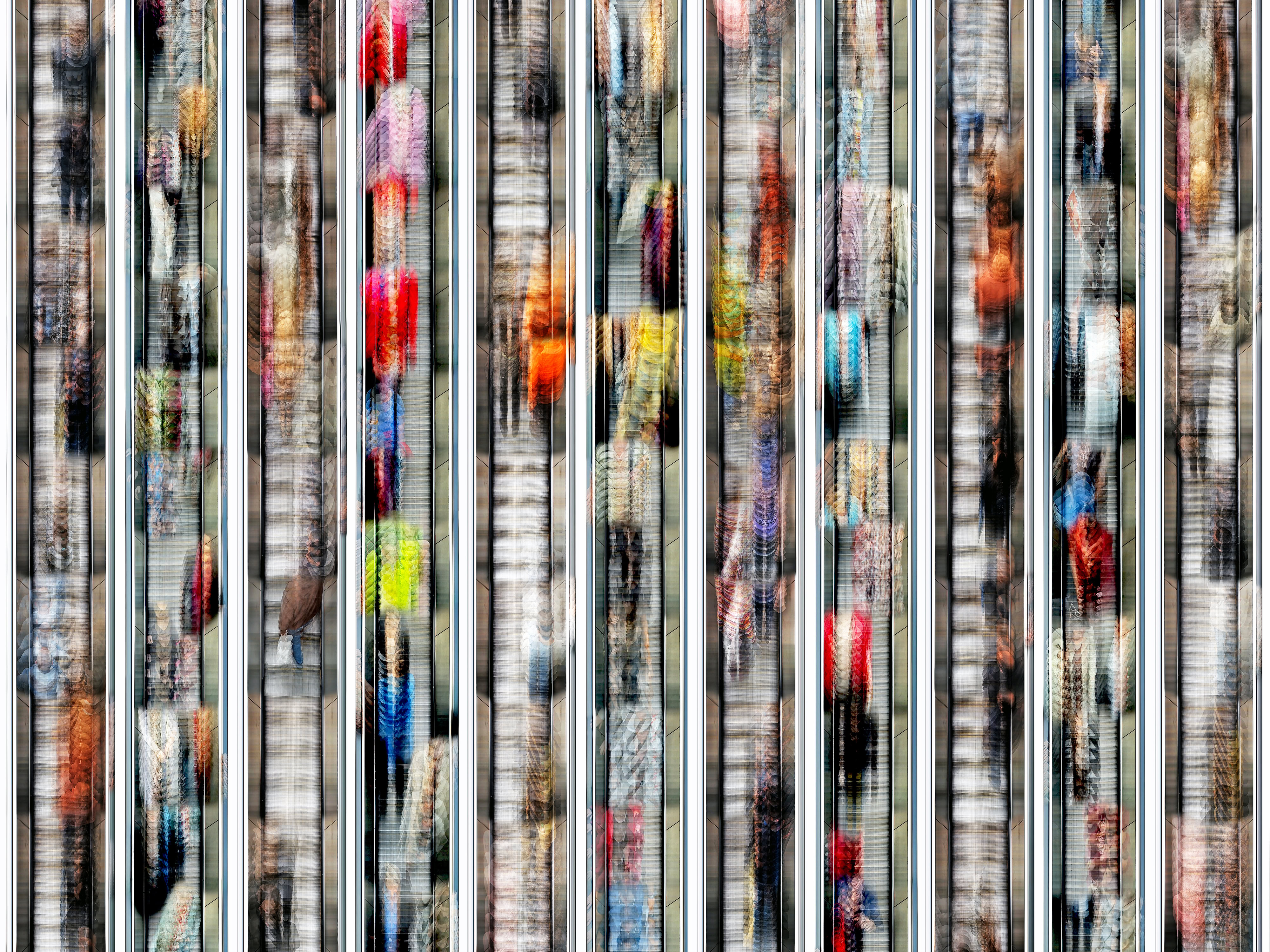 Previously photography fed into video, film, whereas now it is the video itself that forms the essence of his photography. Among his creations is a photograph from the 2018 "short films" series, in which Michlmayr again explores the passage of characters on an escalator. These appear in Escalator VII but in a slightly more blurred (moving) manner than in the original photograph. 25 native/sec images from a video sequence were assembled into a single photograph from a video of a few seconds in length. The resulting photograph "the ghost of the past" shows, in condensed form, four seconds during which the ruins of a World War II bunker on the French coast disappear underwater and reappear with the waves. At each stage of the flood, the movement of the ebb and flow is visible in the final photograph. Thus was born the final image, striking by its aesthetic and graphic quality thanks to the abstraction of the motif and the compression of space-time. Note that the image is still readable from left to right. .[…]